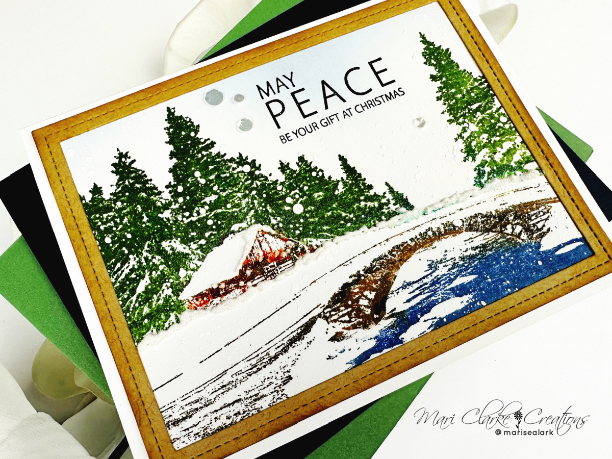 I used the beautiful Penny Black Traverse and Touched by Peace stamp sets! To start my process, I cut a piece of white cardstock to 4.25 x 5.5. I placed the panel in my Misti and then using Ranger Archival Inks, I stamped the different areas of the image. The ink colors I used are: Rustic Wilderness, Vintage Photo, Peeled Paint, Ground Espresso, Black Soot, Stormy Sky and Prize Ribbon. I did some ink blending over the sky area with Distress Oxide Stormy Sky. I splattered the stamped image with Dina Wakley white Gloss Spray. I stamped the sentiment with the Touched by Peace sentiment using black ink.